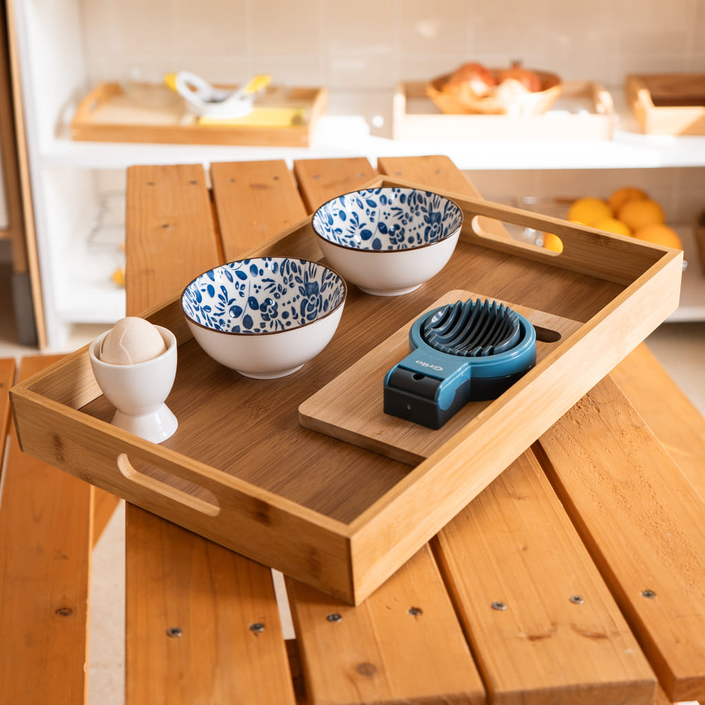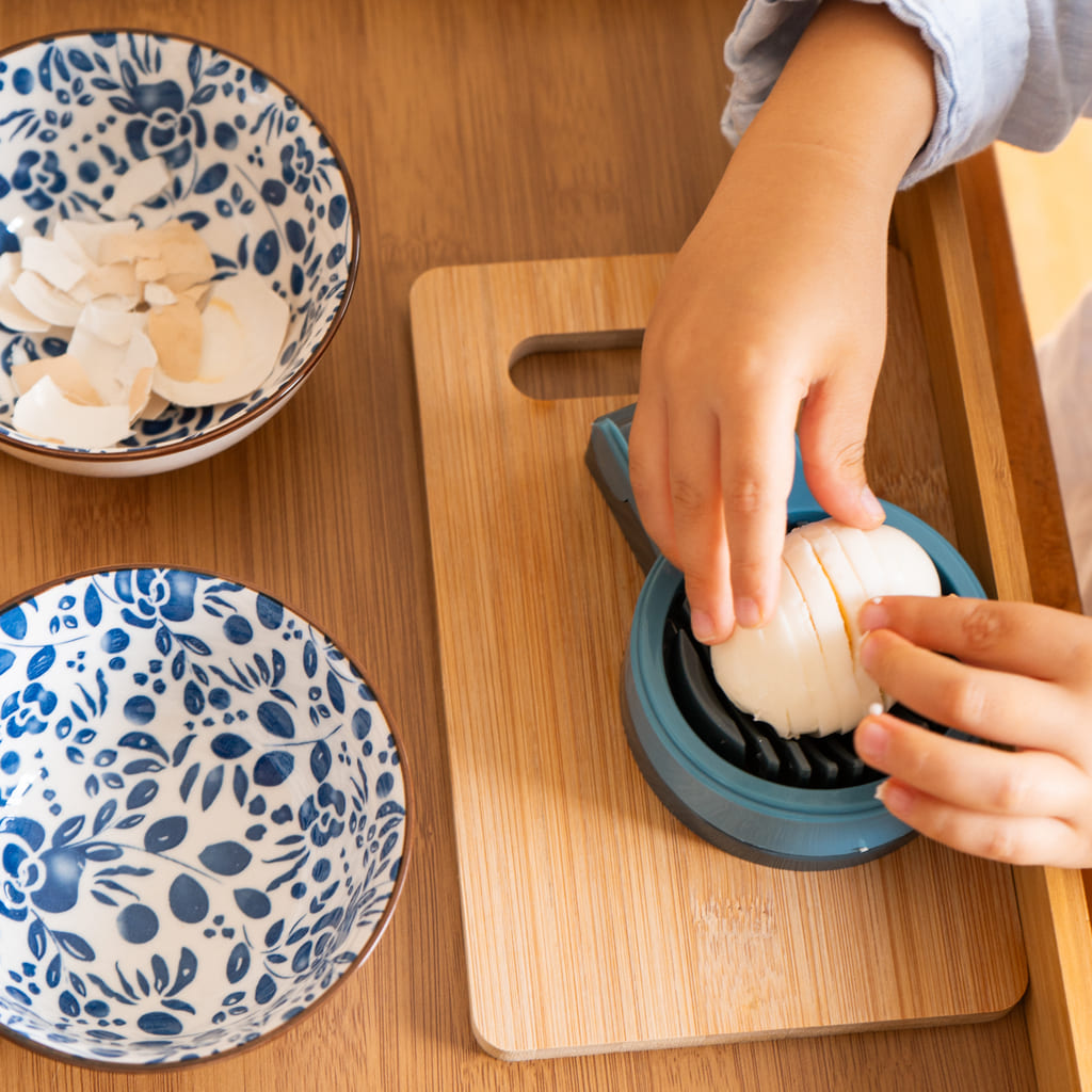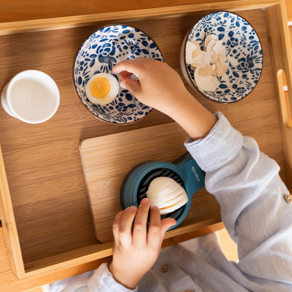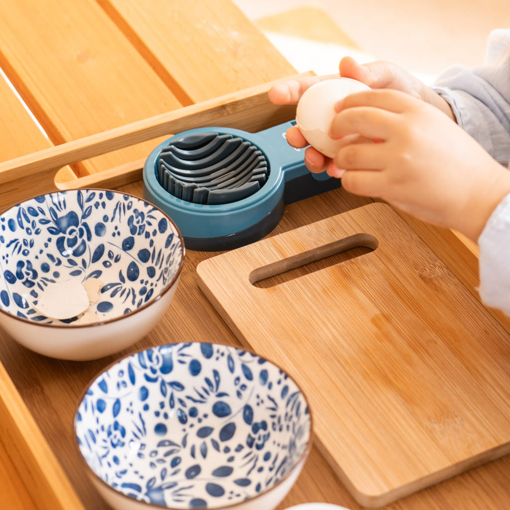 Esta bandeja permite al niño adquirir destrezas de la vida real en la cocina pelando y cortando huevo cocido. Incluye una bandeja de madera de 30x 40 con asas para que pueda ser transportada con facilidad, dos boles de cerámica; uno para echar las cáscaras, y el otro para colocar el alimento una vez cortado, una tabla de madera pequeña, una cortadora para huevo cocido de plástico y metal, y una huevera de porcelana. Esta bandeja preparada favorece a coordinación, trabaja la motricidad fina, trabaja los músculos de los dedos y las manos previos a la escritura.