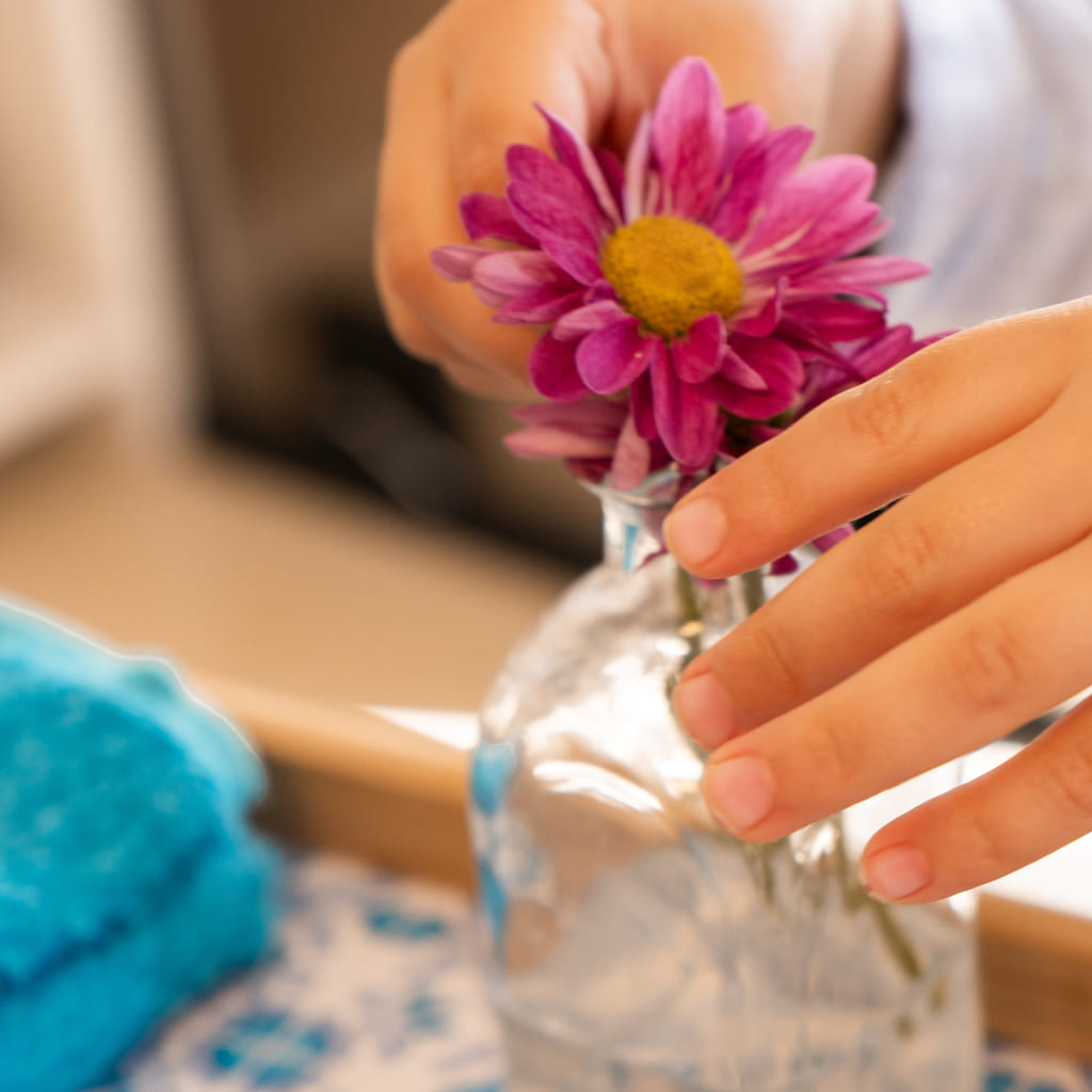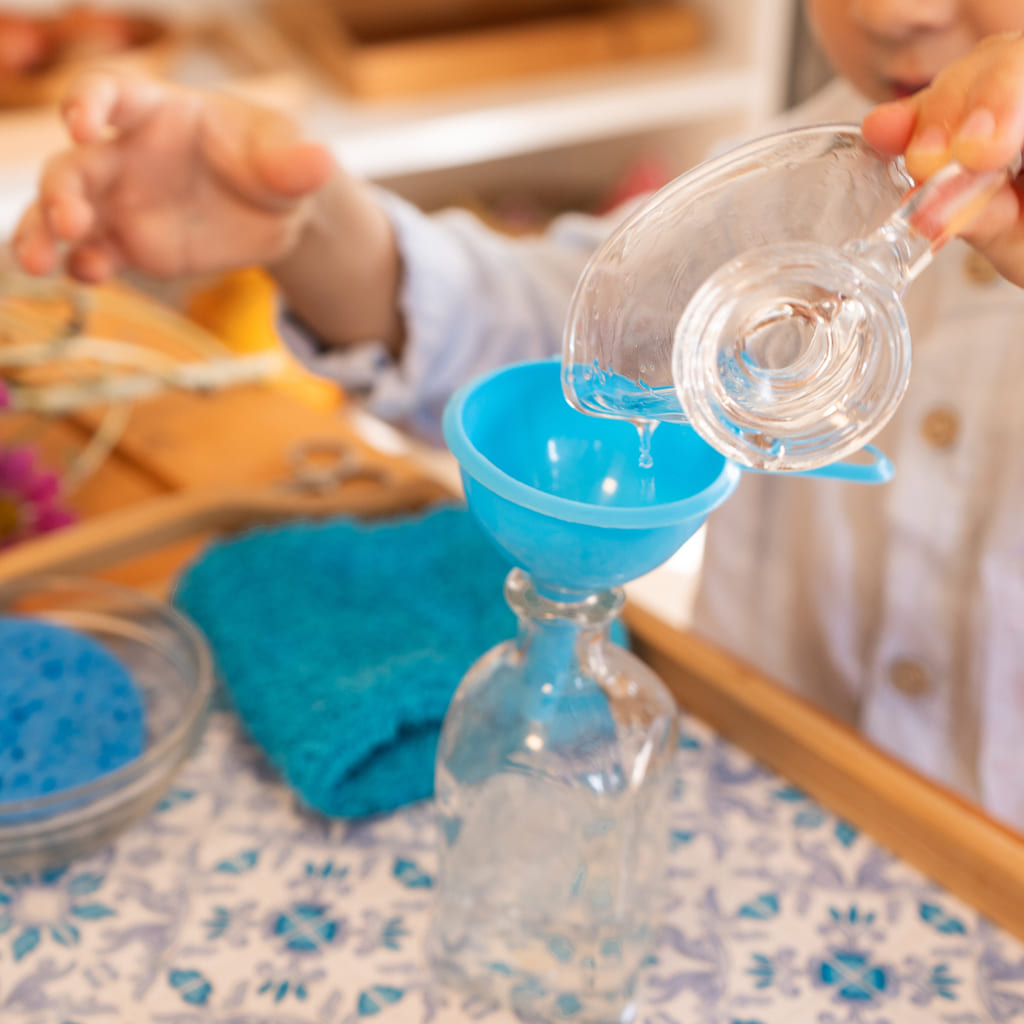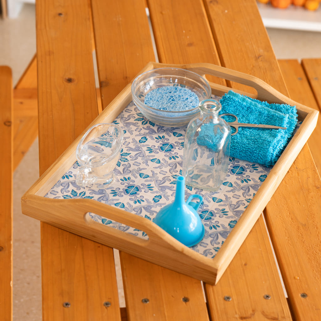 Esta bandeja sensorial le da la posibilidad al niño de trasvasar líquidos usando una jarrita pequeña lo que le ayuda a fortalecer la precisión y su coordinación. Además es una bandeja que estimula sus sentidos y desarrolla la percepción sensorial. Incluye una bandeja de madera decorada (dimensiones) con asas para su fácil transporte, un jarrón pequeño de cristal , una jarra pequeña de cristal, un cuenco de cristal, una esponja pequeña, un embudo pequeño, un trapo pequeño y unas tijeras pequeñas de metal